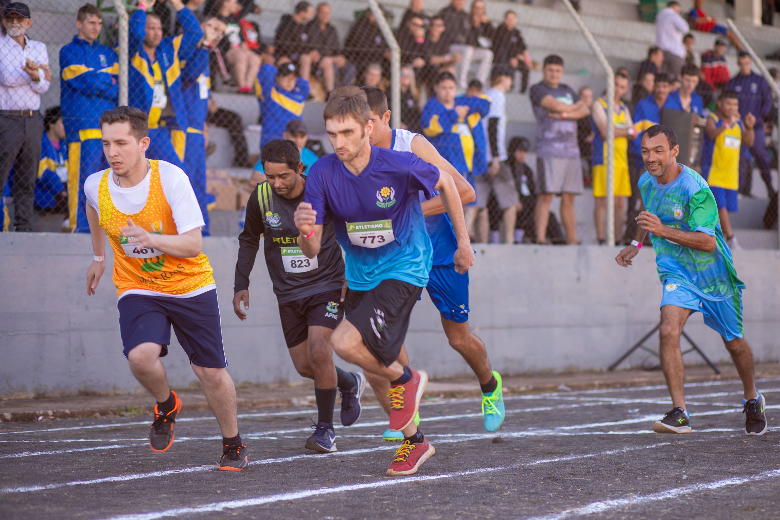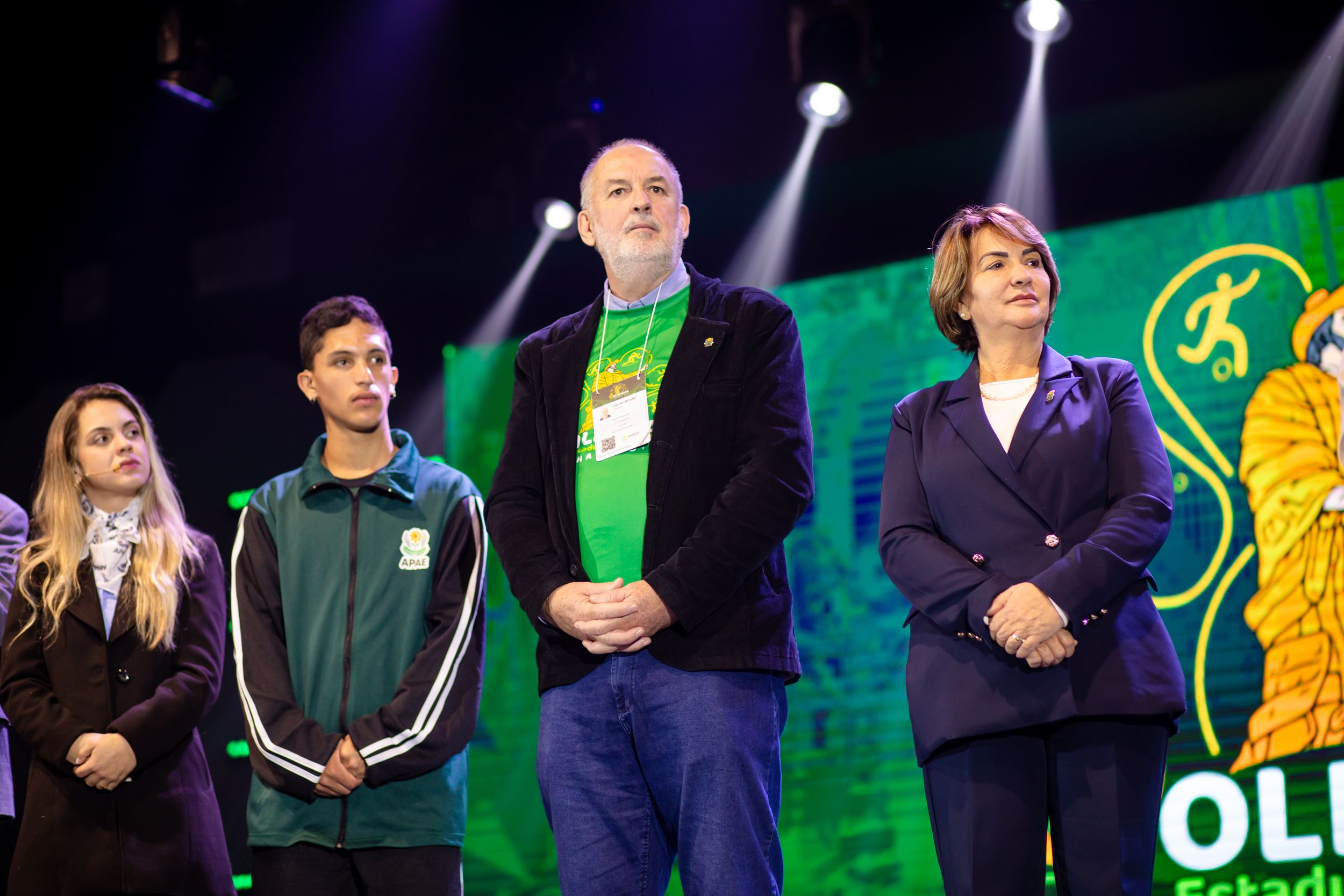 "Utilizamos nossas características físicas na autodescrição porque, neste evento, as principais autoridades são vocês, atletas das APAEs. É por vocês e para vocês que tudo isso acontece. Muito obrigado!"